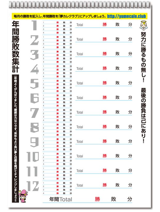 - 仕 様: 表紙、各月カレンダー12枚、年間集計表の合計14枚