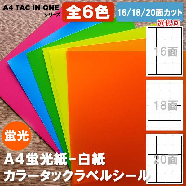 全6色[1~20面カット]A4ルミノ紙カラータックラベルシール‐業務用200シートパック